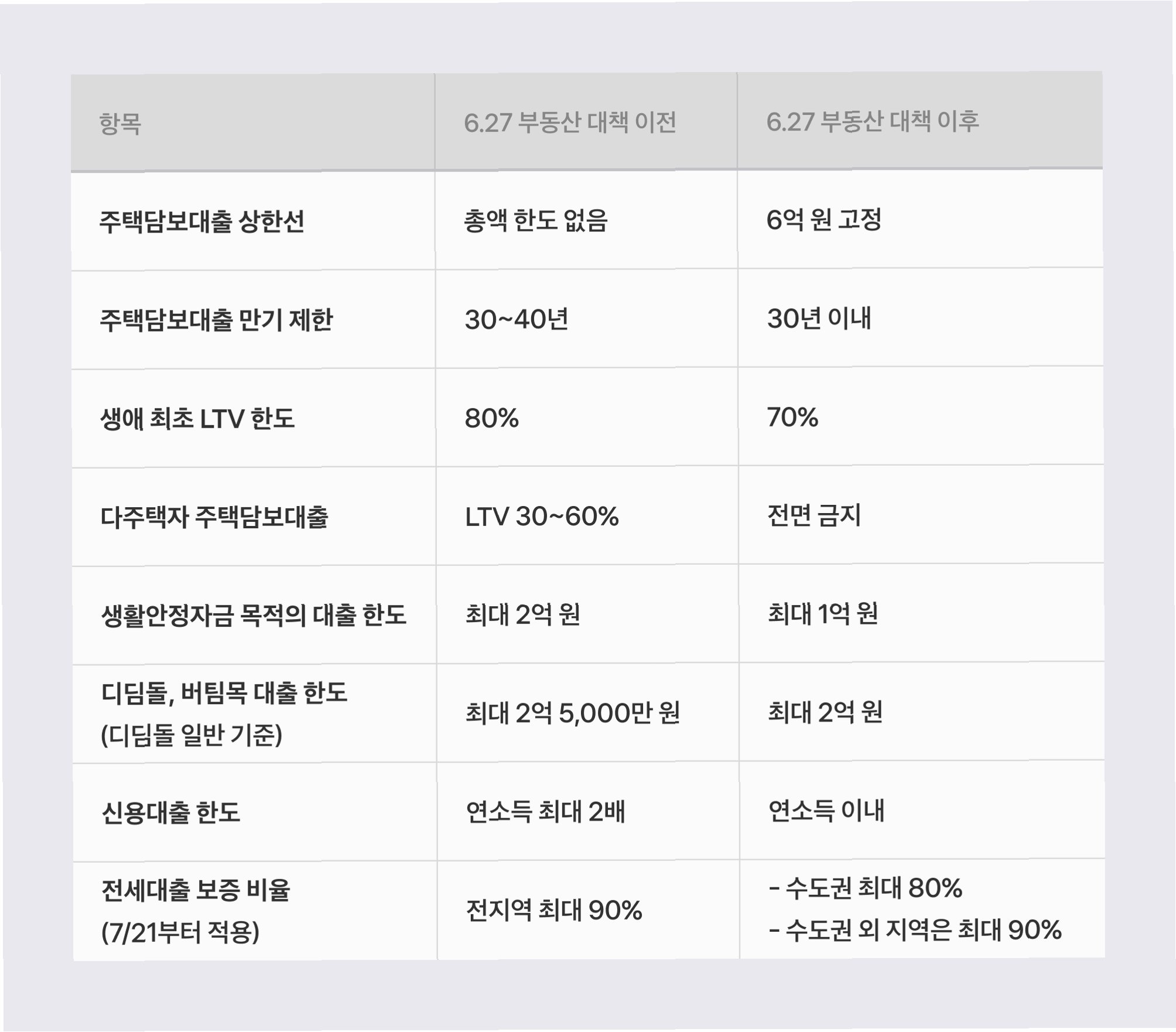 이번 규제 강화의 핵심 중 하나는 대출 규제입니다. 주택담보대출 LTV 비율 축소, 전세대출 규제 강화, DSR(총부채원리금상환비율) 규제 적용 등 대출을 통한 투자를 더욱 어렵게 만들었습니다. 특히, 1주택자에게도 전세대출 DSR 규제가 처음으로 적용되는 것은 주목할 만한 변화입니다. 이는 갭투자를 차단하고, 과도한 부채를 통한 투기를 억제하려는 정부의 의지를 보여줍니다. 또한, 고가 주택에 대한 대출 한도 축소는 고가 주택 시장의 과열을 막고, 소득 수준에 맞는 주택 소비를 유도할 것으로 예상됩니다. 이러한 대출 규제 강화는 부동산 시장의 자금 흐름을 억제하고, 투기 세력의 시장 진입을 어렵게 만들 것입니다.