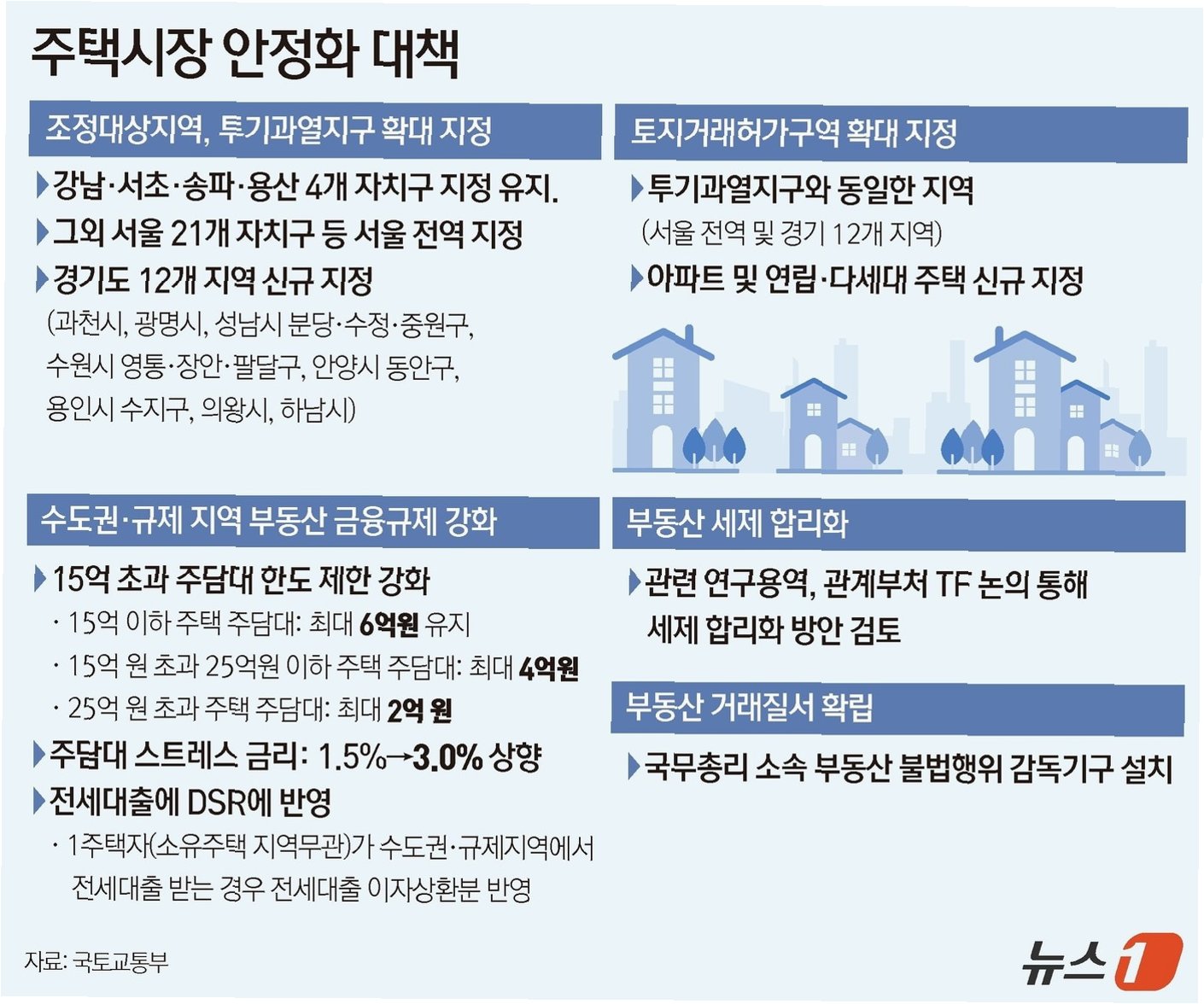 이번 '주택시장 안정화 대책'은 조정대상지역, 투기과열지구, 토지거래허가구역 지정을 통해 3중 규제를 가하는 것을 골자로 합니다. 특히 서울 25개 자치구와 경기도 12개 지자체가 규제 대상에 포함되면서, 수도권 부동산 시장 전체가 강력한 규제의 영향권 안에 놓이게 되었습니다. 이는 주택 매수 수요를 억제하고, 시장 과열을 진정시키려는 정부의 의지를 보여주는 것으로 풀이됩니다.